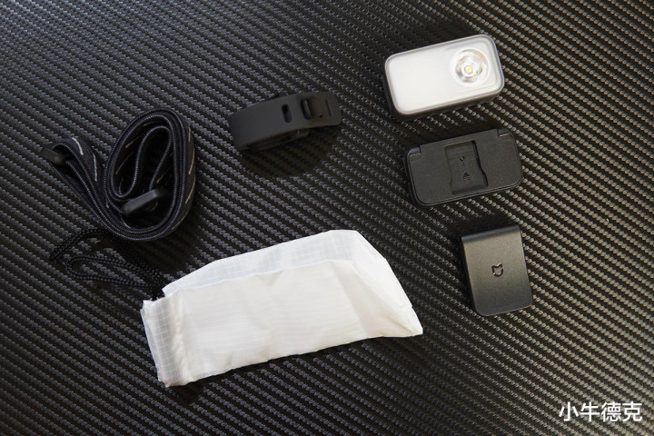把配件全部拿出来,分别是多功能灯主体、骑行附件、帽夹、头灯带、便携收纳袋。这个收纳袋除了收纳,还能兼做露营灯配件,我会在文章后半段展示这一点。